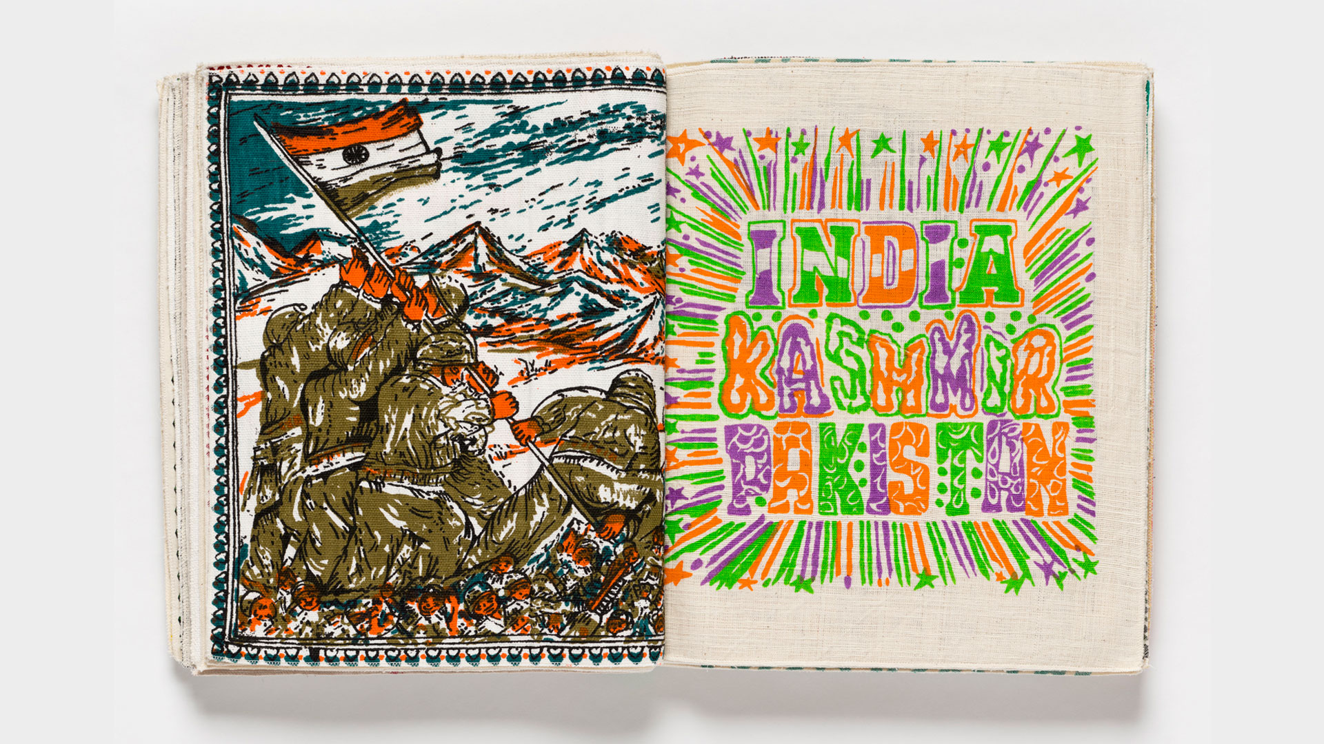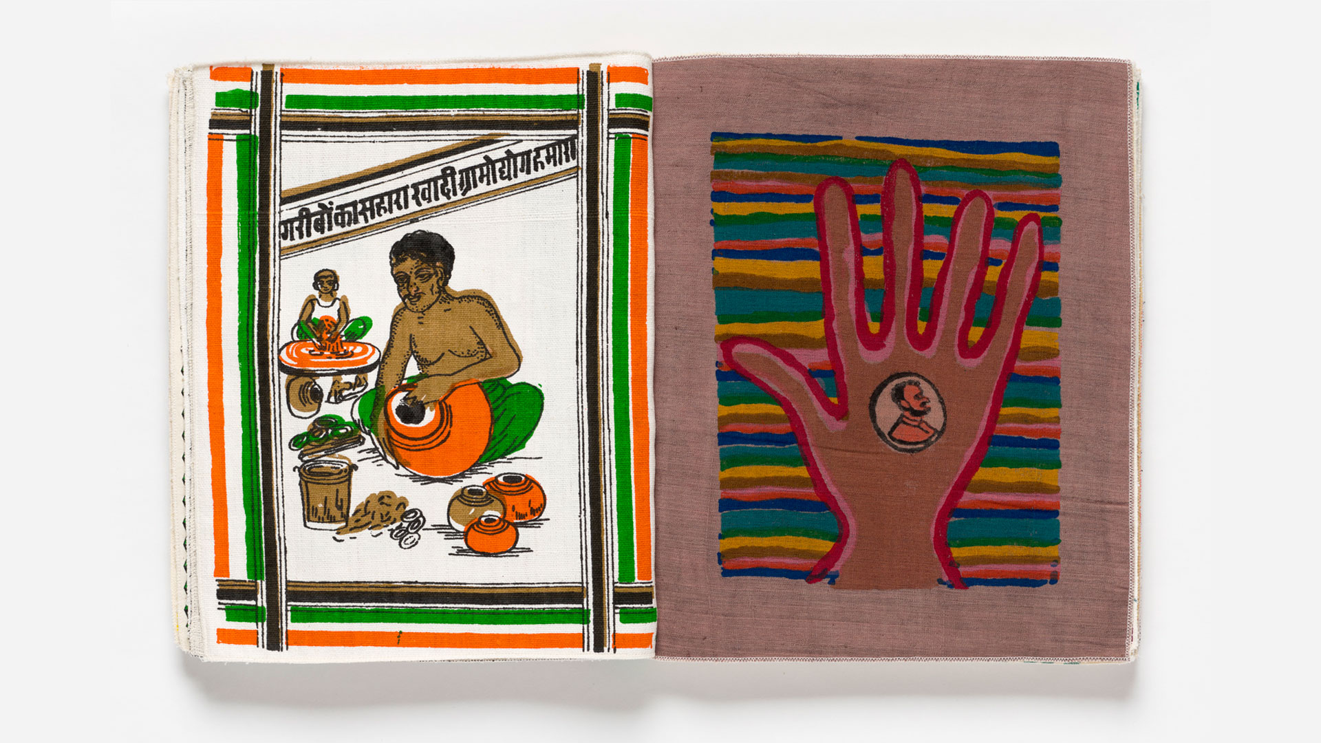 A book made of hand-woven cloth with printed text and illustrations, created during 2013-2016 to honor Mohandas Gandhi and the locally produced khadi cloth he made and wore as a symbol of Indian self-reliance and independence. Woodblock and silkscreen-printed on home-spun khadi by Sri Gandhi Ashram, Akbarpur; The Chinmoyee Kala Niketan, Varanasi; Nandita Devraj/Rudraksh, Jaipur; with original weavings by Kala Aur Katha, Orissa; and Firoz Ansar, Varanasi. These workers who make the homespun cotton khadi cloth are primarily women who are often the sole support for their families. Each thread is spun by hand, requiring concentration and thousands of hours of work. Color separations and silkscreen images were mostly traced by hand (not photo-transferred), all woodblocks were cut and printed by hand. There are almost no mechanical processes used to produce this book. The collaboration on the book was entirely via email communications between Aaron Sinift in USA, and by Jitendra Kumar & Kahkashan Khan in Varanasi, India where it was produced, with additional guidance from Mr. Vijay Kumar Handa of the Gandhi Hindustani Sahitya Sabha, New Delhi.