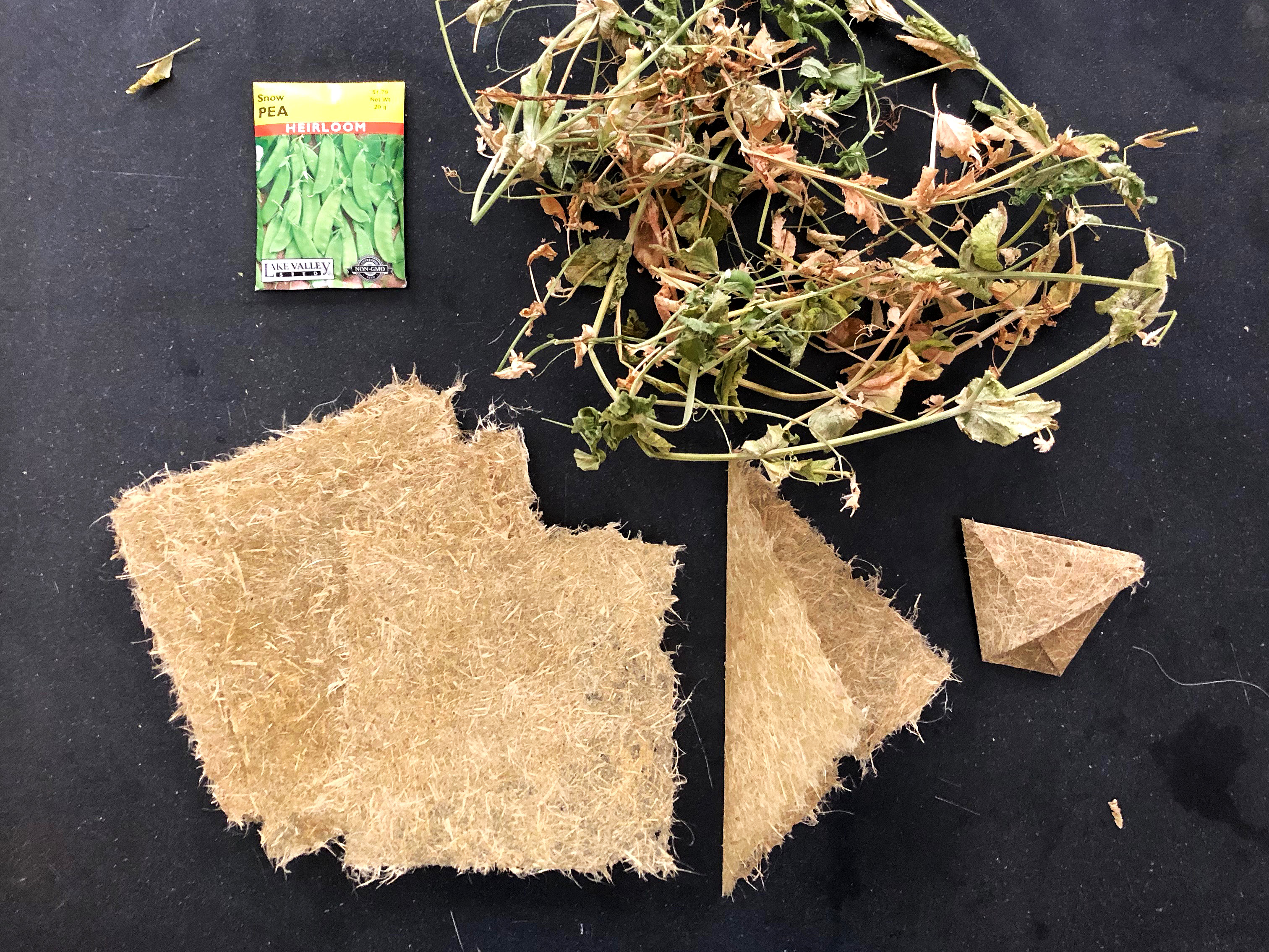 In collaboration, the artists alternate their contributions. Rich soil is produced in a red wiggler worm composting unit designed and tested by Liz in Germany and re-created by Jill in Milwaukee. In an ongoing process, organic food waste from Jill’s household will be combined with shredded paper (cellulose) from her discarded studio writings, musings, and drawings, plus shredded airmail letters from Liz documenting their conceptual journey. Ceramic vessels with a simple self-watering system (Liz) will be planted with peas (Jill) in the special compost enriched by worm casings. The pea is an easy-to-grow, sustainable crop that gives back nitrogen to exhausted soil in agricultural rotation, produces a reliable food source of plant protein, and can be made into eco-friendly material to replace single-use plastic. Their first crop will be produced in the brutal conditions of a rooftop garden; the second during the exhibition, under artificial light. Liz’s unglazed stoneware vessels will in time show traces of minerals and watermarks on their surfaces reminiscent of diagrams of geological time. The peas will be harvested and eaten by the artists, and the rest of the plants broken down and reconstituted by Jill into sheets of folded handmade paper.