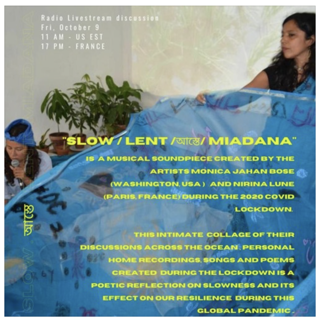 During the pandemic, Bose was unable to travel to France to collaborate with musician Nirina Lune on a performance. Instead they communicated via the internet to create a sound piece called Slow. The piece includes vocals by both artists in multiple languages, along with sounds of Covid life captured in and around Washington, D.C., and Paris.